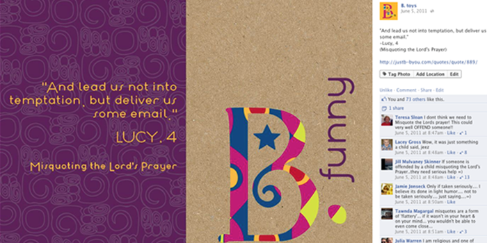 The toy aisle became our media plan, and “Just B. You” became our rallying cry for the tiny humans we hoped to inspire. Packaging and displays drew moms into a social community where they shared their children’s unfiltered quotes, kids simply being themselves. Those voices became the brand’s soul. Moms were able to create beautiful art out of their kids’ quotes and share them with the world. (And they did!) As we nurtured the community with intention, it soon took on a life of its own. A onesie giveaway went viral, while a thoughtful blogger program built trust and helped this oddball toy company become a mom favorite.
